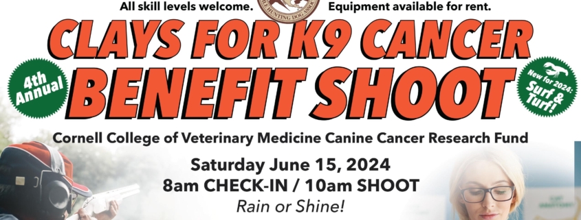 Join us for the fourth annual Clays for K9 Cancer Research Shoot to benefit the Cornell College of Veterinary Medicine Canine Cancer Research Fund on Saturday June 15, 2024 at Mid-Hudson Sporting Clays in New Paltz, NY.