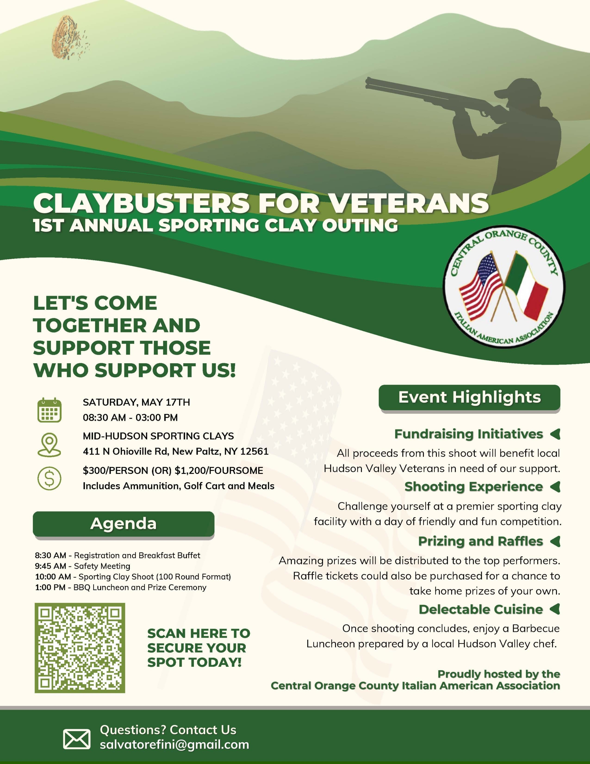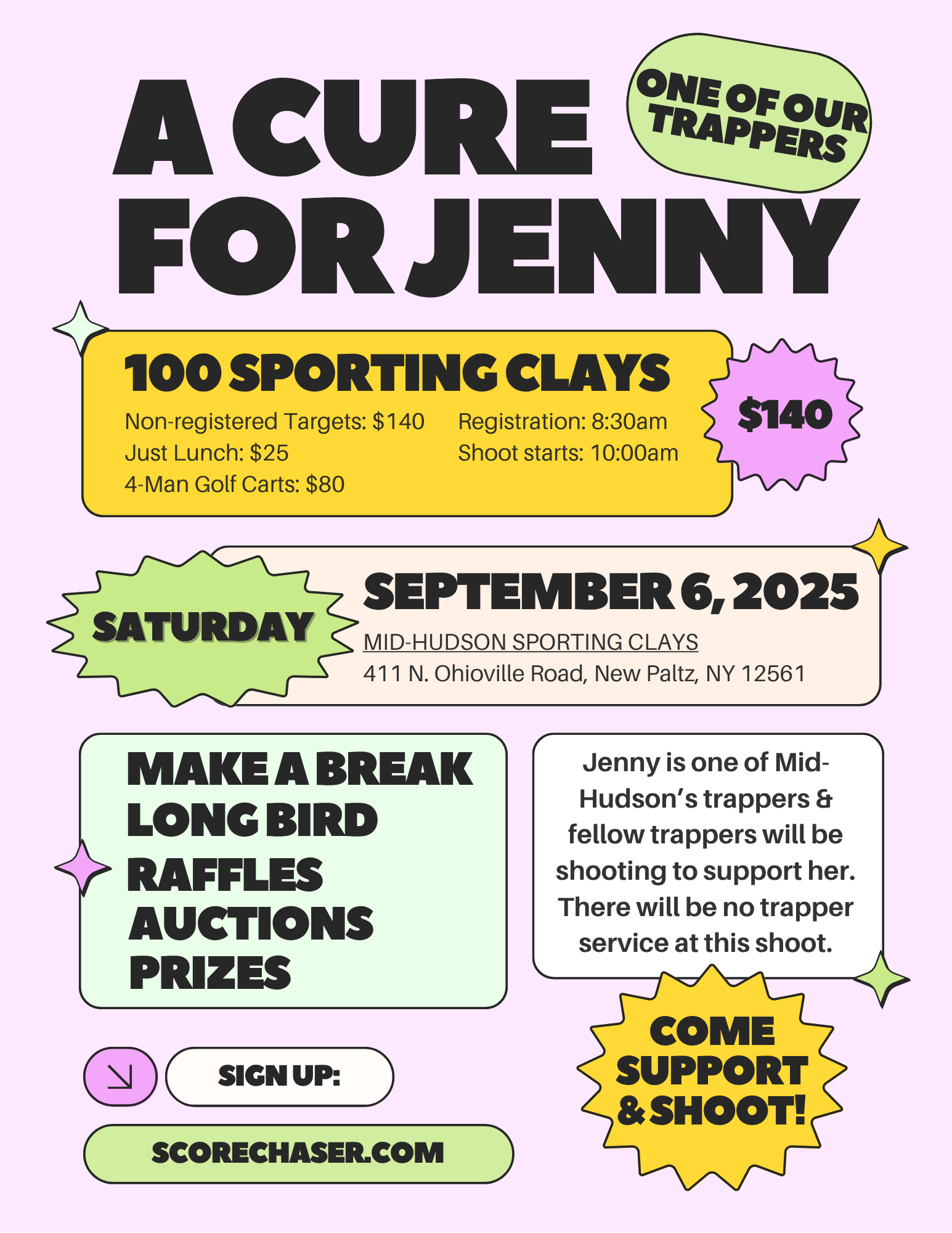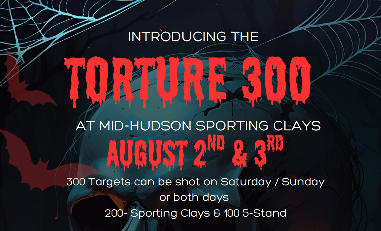 100 Sporting Clays Register on Scorechaser.com Non-registered targets: $140 Just lunch: $25 4-man golf carts: $80 Jenny is one of Mid-Hudson's trappers & fellow trappers will be shooting to support her. There will be no trapper service at this shoot. Make a break Long bird Raffles Auctions Prizes